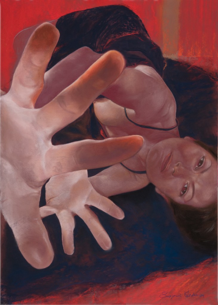 Il pastello mi permette di lavorare su morbidezza e intensità cromatica, lasciando emergere il movimento in modo spontaneo. Questa immagine parla di coraggio e di apertura: del momento in cui scegliamo di esporci, senza filtri.